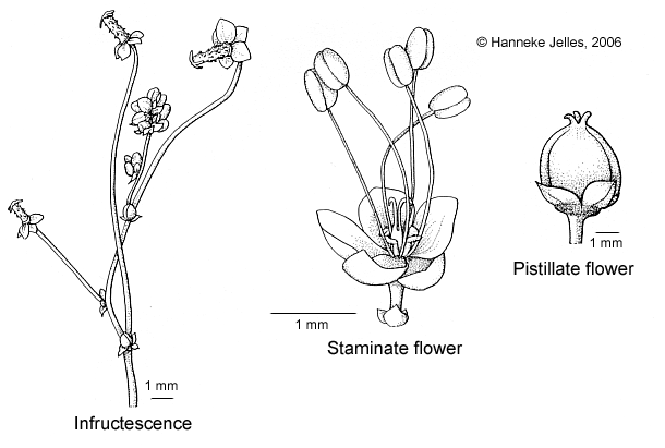 Shrubs up to 4 m high, dioecious; side branches, especially lower ones often with thorny end. Stipules 1.11.7 by 0.70.8 mm, margin often fimbriate, persistent. Leaves distichous; petiole 36 mm long, c. round; blade elliptic to obovate, 18 by 0.65 cm, length/width ratio c. 1.6, papery; base usually attenuate, margin flat, apex rounded to slightly acuminate, above dark green, underneath glaucously papillate, light greenish; venation indistinct on both sides, nerves 613. Inflorescences fascicles. Flowers: sepals outer two smaller than inner 3. Staminate flowers c. 1.5 mm in diameter, greenish to yellowish, pendulous, sweet scented; pedicel 26.5 mm long, pale light greenish; sepals 0.71.2 by 0.31.1 mm, light greenish with white margin; filaments 1.22 mm long, white, anthers 0.30.5 by 0.20.3 mm, light yellow; disc glands fleshy, yellow; pistillode 1.52.3 mm long, basally connate, deeply divided into 3 branches, apical 0.30.7 mm bent and stigma-like. Pistillate flowers c. 2 mm in diameter; pedicel 212 mm long; sepals 0.71 mm diameter, disc annular, thin, entire, 0.71 mm diam; ovary c. 1 by 0.8 mm wide; style 0.50.7 mm long, stigmas 0.81.1 mm long, upper third split. Fruits globular, 3.45.2 mm in diameter, white. Seeds 2.22.4 by 1.21.8 mm, with thin sarcotesta.