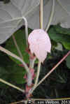 Trees to 25 m tall and 40 cm d.b.h.; twigs 1226 mm in diameter, round in section, apically tawny furfuraceous, otherwise ± glabrous, copious red latex. Bark brown to orange-brown, with prominent lenticels. Stipules huge, elliptic, to 6 by 3 cm, smaller on mature twigs, erect, persistent, initially pinkish-green coriaceous, drying chartaceous black, ± glabrous. Leaves: petiole stout, 2050 cm long, rounded, slightly glaucous, with tawny woolly hairs; blade huge, broadly ovate, to 70 by 50 cm, but often smaller, trilobed to subentire, base broadly rounded, peltate to 515 cm, margin ± entire, apex dotted with round nectaries, surfaces at first densely tawny woolly pubescent, lower surface at maturity with erect soft hairs. Staminate inflorescences erect panicles, 8-30 by 1020 cm, to 5 axis orders, densely woolly pubescent; bracteoles broadly ovate, c. 5 by 3 mm, base narrow, margin irregularly dentate, apex rounded to broadly acute, usually with a nectary, woolly. Staminate flowers 1225 per cluster, c. 0.7 mm long, shortly pedicellate; sepals 3, free, woolly; stamens 2- 3, anthers 4-locular. Pistillate inflorescences 1018 cm long, to 4 axis orders, otherwise as staminate. Pistillate flowers c. 2.5 mm long, calyx urceolate, persistent; ovary 2-locular; styles 11.5 mm long, free, persistent. Fruits bilocular, c. 5 by 810 mm, without spines, yellow, sticky; pedicel 813 mm, densely woolly. Seeds ovoid, c. 3.5 mm in diameter, black, pitted; aril black.