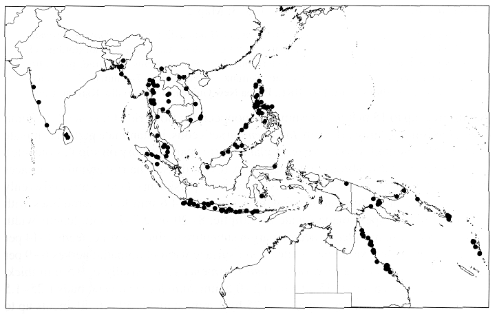 Distribution From India and Sri Lanka through SE Asia mainland to S China and Indochina, throughout Malesia (absent in the Moluccas) to Australia (Queensland), the Solomon Islands and Vanuatu.