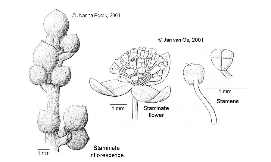 Leaves (ovate to) elliptic (to only some of the leaves slightly obovate), petiole 0.58 cm long, blade 6.623 cm long, base shortly narrowing, rounded to acute to cuneate to attenuate. Staminate flowers several to many per node, in fasciculate or glomerulate, non-branching clusters. Philippines, Sulawesi, New Guinea (New Britain) |