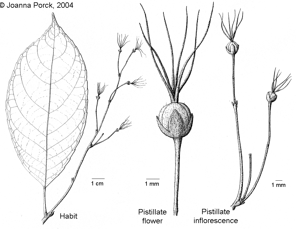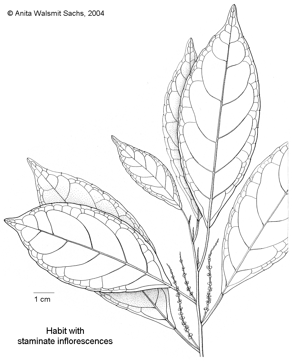 (Small) tree, up to 15 m high, presumably monoecious; flowering branches 1.52 mm thick. Bark smooth, grey to brown. Indumentum sericeous, in staminate parts also hirsute and variably oriented, vegetative parts glabrous (to sparsely hairy on stipules outside), generative parts (sub)glabrous to sparsely hairy (ovary densely hairy); granulate surfaces absent. Stipules 1.53 by 0.751 mm, caducous (to persistent). Leaves inserted evenly along branches or in Terminalia-growth; petiole 0.84.6 mm long, sometimes with 2 raised glands at apex; blade (ovate to) elliptic, 820 by 2.77.3 cm, length/width ratio 2.43.4, base rounded to acute, margin subentire to finely serrate, teeth 314 per side, apex acuminate, very apex acute, lower surface without domatia; nerves 69 per side. Staminate inflorescences: only small fragments seen, basally c. 0.5 mm thick, flowers 1 per node; bracts 0.250.5 by 0.20.5 mm. Staminate flowers: buds 1.251.5 mm diam., brown when dry; sepals c. 1.75 by 1 mm; stamens 5976, filaments up to c. 1 mm long, anthers 0.30.4 by 0.40.5 mm, apiculum c. 0.1 mm long. Pistillate inflorescences 3.56 cm long, basally 0.51 mm thick, 1-flowered, with 25 sterile bracts; latter 12.5 by 0.51.25 mm, persistent. Pistillate flowers: pedicel usually with abscission zone; sepals (3 or) 4 or 5, 12 by 0.751.5 mm, persistent; locules 3; style 1.55 mm long; stigmas erect, 1324 mm long. Fruits usually 3-seeded, 810 by 1316 mm, ± smooth, brown when dry. Seeds 77.5 by 78 mm; hilum subcircular, somewhat raised, 11.5 by c. 1 mm.