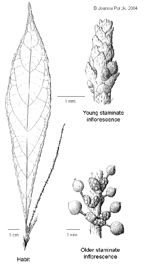 (Shrub to) tree, up to 30 m high, dbh up to 50 cm, dioecious (to rarely monoecious); flowering branches 14.5 mm thick. Outer bark smooth to slightly roughened or fissured, thin, grey to brown (to greenish), cream to yellow inside, inner bark 310(20) mm thick, light brown to yellowish to straw; sapwood white to straw to creamy yellow. Indumentum sericeous, in staminate parts also hirsute and variably oriented, vegetative parts (excluding domatia) glabrous, generative parts (sub)glabrous to sparsely hairy (except ovary glabrous to densely hairy); granulate surfaces absent. Stipules 23.5 by 0.751.5 mm, early caducous. Leaves usually in Terminalia growth (flushes); petiole 0.99 cm long, usually with 2 raised glands at apex; blade (ovate to) elliptic (to slightly obovate), 524 by 1.79.7 cm, length/width ratio 1.73.8(4.6), base obtuse to cuneate (to attenuate), margin subentire to serrate with coarse teeth, teeth 720 per side, apex (rounded to acute to) acuminate, very apex retuse to rounded to acute, lower surface with shallow, open domatia with single and tufted hairs; nerves (3)410 per side. Staminate inflorescences up to 25 cm long, basally 0.51.5 mm thick, flowers 3several per node, in fascicles, rachis green; bracts 12.5 by 12 mm. Staminate flowers: pedicels up to 7 mm long, light green; buds 1.53 mm diam., brown when dry; sepals 24 by 12.5 mm, (light) green; stamens 48120, filaments up to 1.8 mm long, anthers (0.3)0.40.6 by 0.30.6(0.8) mm, yellow to cream, apiculum 0.10.3 mm long. Pistillate inflorescences 2.511.5 cm long, basally 0.751.5 mm thick, 1-flowered, with 14 sterile bracts; latter 1.52 by 0.752 mm, early caducous. Pistillate flowers: abscission zone absent; sepals (4 or) 5, 12.5 by 12 mm, green, caducous to persistent; locules 2 (or 3); style 112 mm long; stigmas erect, 1530 mm long. Fruits: one locule often reduced (perfect 3-seeded fruits extremely rare), 1118 by 1321 (1-seeded) or 1928 mm (2-seeded), tardily opening, surface ± smooth to verrucose, green when fresh, dark brown to dark grey when dry, inner wall often mottled. Seeds 8.514 by 8.513.5 mm; hilum elliptic to obovate, 2.55.5 by 12.5 mm.