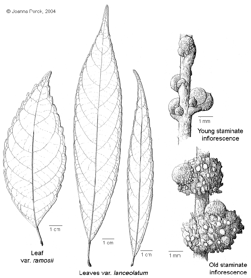 Note Cleidion lanceolatum is treated here as a rheophytic variety of C. ramosii, leaf length/width ratio being the only unambiguous character to separate the taxa. Variety lanceolatum also tends to have somewhat longer stipules, bracts, pistillate pedicels, sepals and stigmas, but these measurements overlap with those of var. ramosii.