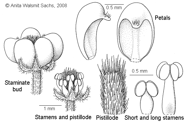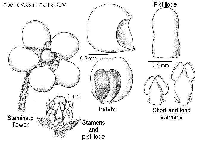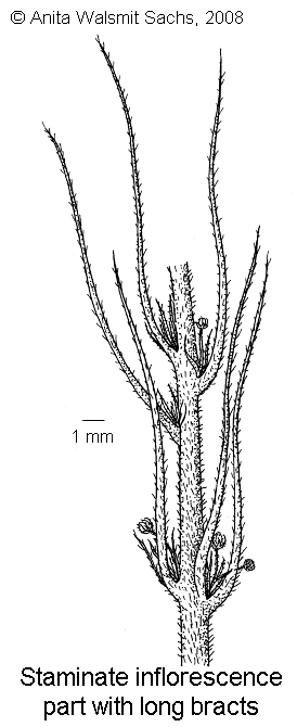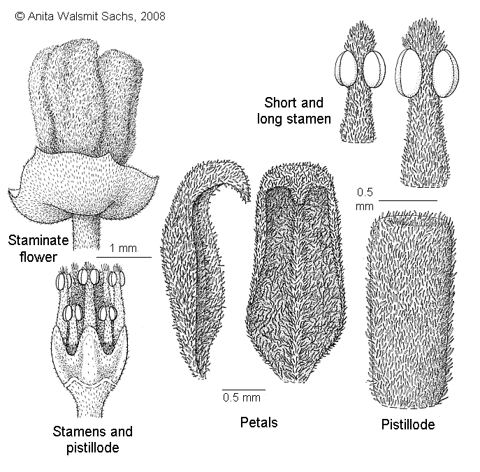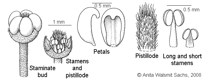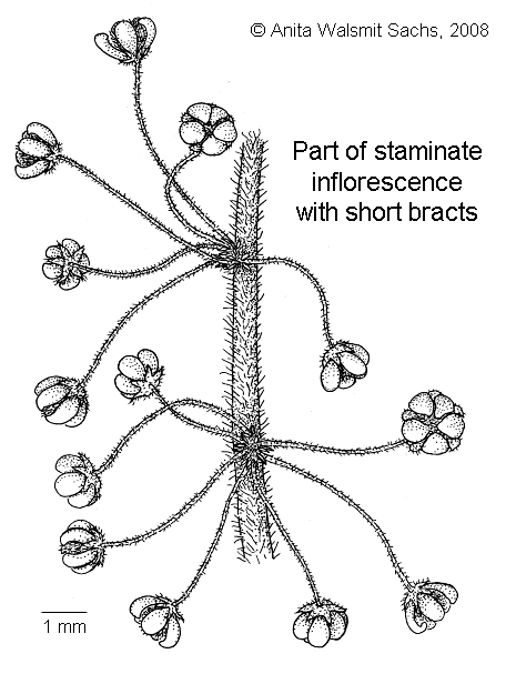 Plants subglabrous to hirsute with up to 1 mm long hairs. Stipules 0.83 mm long, glabrous inside. Bracts 0.72.7 mm long. Pistillode glabrous to hairy with short to long hairs. Fruits somewhat hairy |