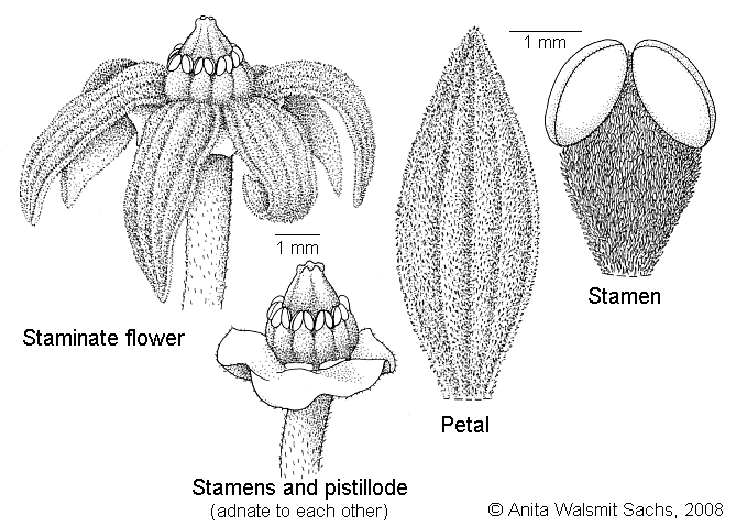 Shrubs to small trees up to 10 m high, bole up to 3 m high, dbh up to 15 cm; flowering branches 13 mm thick, sericeous, glabrescent. Indumentum simple hairs, short (< 0.5 mm long), mainly sericeous, dark brown and yellow or yellow only. Outer bark smooth to fissured, very hard. Stipules triangular, 0.82 by 0.30.6 mm, outside hairy, inside glabrous, usually late caducous. Leaves: petiole 23.5 mm long, flattened above, hairy; blades ovate to elliptic, 325 by 1.78 cm, length/width ratio 2.23.9, pergamentaceous to coriaceous, brownish green when young, generally drying light green, base shortly attenuate to cuneat, margin entire, flat, apex long acuminate, often mucronulate, upper surface glabrous except for some hairs on basal part midrib (and nerves), lower surface somewhat hairy, mainly on venation, venation generally slightly raised above but midrib flat, raised beneath, nerves 57 per side. Inflorescences terminal (or subterminal when several, probably due to sympodial length growth), up to 52 cm long, green, hairy, pistillate flowers single; bracts 0.81.5 by 0.250.5 mm, glabrous inside. Buds green. Flowers 5-merous, green to white; calyx with 5 lobes, 0.81.3 mm deep, lobes triangular, 0.40.6 by 0.40.7 mm, glabrous inside; petals 5, elliptic, cucullate, as deep as high, 11.2 by 0.81.3 mm, 11.5 mm deep, glabrous, midrib strongly thickened inside, often furrowed outside. Staminate flowers 3.64 mm in diam.; pedicel 6.39 mm long; stamens 10 in two whorls, of different lenghts, filaments glabrous, c. 0.5 or 0.50.7 mm long, often band-like in lateral view, often S-shaped; anthers 0.40.5 by 0.40.5 mm, thecae separated, ± parallel, horizontal because of S-shape filaments, cream to light yellow; pistillode 0.70.8 by 0.51 mm in diameter, glabrous. Pistillate flowers 2.53 mm in diam.; pedicel c. 0.4 mm long, elongating in fruit up to 2.5(4) mm; ovary c. 1.2 by 1.3 mm, very shallowly 5-lobed with central furrow due to imprints of petals, 2-locular, stigmas c. 0.5 mm long, completely split several times. Fruits laterally flattened ovoid drupes, often with 2 ridges along edges, 99.5 long by 6.27.2 high by 5.57.1 mm thick, somewhat hairy, wall thin, woody, c. 0.4 mm thick, very light green to pale whitish green when immature. Seeds seen immature, c. 8.5 mm long by 5.5 mm high by 1 mm thick.