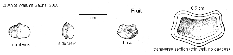 Leaves: petioles flat above to round. Flowers: convex or cucullate, glabrous except often for a few apical hairs. Staminate flowers: filaments and connectives glabrous. Pistillate flowers: ovaries 2-locular. Fruits laterally flattened, wall thin, c. 0.4 mm thick, entire.