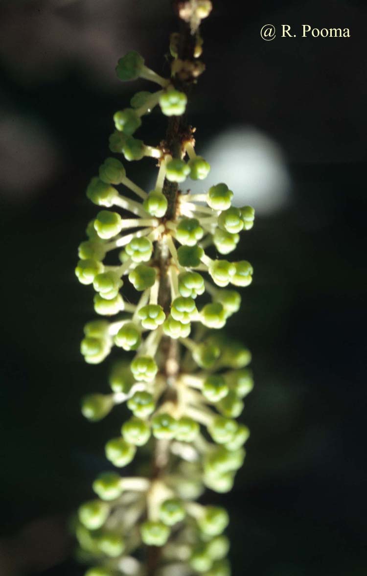 (Big) trees, up to 35 m high, bole up to 20 m high, dbh up to 80 cm; sometimes fluted or buttresses present, up to 3 m tall; flowering branchlets 2.53 mm thick, sericeous-tomentose, white to whitish green. Indumentum simple short (less than 0.5 mm long), mainly sericeous hairs, generally most parts rather glabrous except young branchlets. Outer bark white to grey to yellowish grey to yellowish to yellowish brown to light brown to greenish or dark brown, smooth to fissured to slightly vertically ridged-corky, not peeling to peeling, yellow and grey-brown on back, 0.21 mm thick; under bark pinkish straw; inner bark pinkish straw to light red to dark red to red-brown, 615 mm thick, fibrous, rather brittle to very hard; wood yellowish to orange brown, hard. Stipules triangular, 0.81 by 0.60.7 mm, thick, outside subsericeous, inside glabrous, very early caducous. Leaves: petiole 5.513 mm long, channelled above, (sub)glabrous; blades ovate to elliptic, 5.220.5 by 2.16.7 cm, length/width ratio 2.53.1, coriaceous, drying brownish, base shortly attenuate to acute, margin entire, flat, apex bluntly acuminate, upper surface glabrous (to few hairs when young) , glossy, green above, lower surface glabrous to subsericeous when young, paler green, young leaves light green, venation slightly raised above except for the slightly sunken midrib, nerves 911 per side. Inflorescences terminal, up to 18 cm long, sericeous; bracts up to 0.8 by 0.3 mm, thick, inside glabrous. Flowers 5-merous; calyx c. 1.5 mm deep, glabrous inside, lobes 5, triangular, c. 0.2 by 0.2 mm, apex acute; petals 5, elliptic, 3.13.5 by 0.81 mm, apex acute, hook-like, bend inwards, tomentellous on both sides, greenish white to white. Staminate flowers c. 4 mm in diam. (young flower); pedicel up to 12 mm long; petals probably spreading horizontally; stamens 10, in two whorls, free, filaments round, hirsute, of two lengths, up to 1.7 mm long, connective with hairy apical appendix up to 0.3 mm long, anthers c. 0.4 by 0.6 mm; pistillode c. 2 by 0.5 mm, hairy. Pistillate flowers c. 2 mm in diam., not fully open, pedicel c. 1. 5 mm long, elongating up to 4.5 mm in fruit; ovary 4- or 5(6)-locular, c. 1.2 by 1.2 mm, ribbed, apically narrowing and with crater-like opening, stigmas only seen as split bands on inside of apical opening. c. 0.4 mm long. Fruits subglobular to ovoid to angular-subglobular, 1.53.8 cm high by 2.14.5 cm diam., green when unripe, fleshy, woody when dry; wall very thick, 817 mm. Seeds flattened, boomerang-like in transverse section with hollow side extrors, c. 7.5 mm long.
