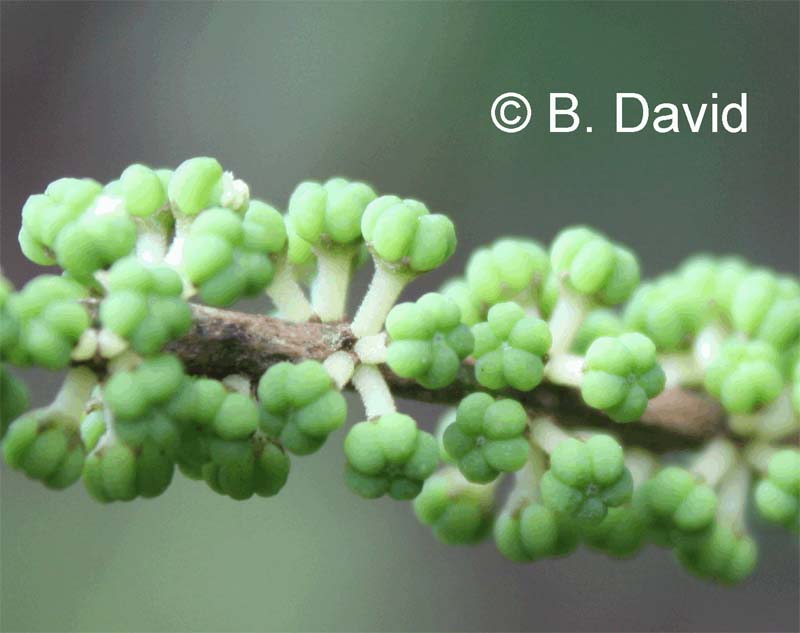 (Shrubs to ) small trees up to 28 m high, bole up to 10 m high; dbh up to 40 cm; buttresses seldom present (Solomon Islands sometimes), thin and plank-like, steep to up 1.5 m high, (seldom fluted to first branch); flowering branches 240 mm thick, longitudinally grooved when dry, only young parts hairy (to completely). Indumentum simple hairs, either ver short, whitish hairs (less than 0.5 mm long) and sometimes also long, yellowish, hirsute hairs (up to 1 mm long), see note. Outer bark light brown to greenish grey to grey, smooth (to fissured to scaly), c. 0.2 mm thick; under bark pale greenish cream to yellow to reddish to brown; inner bark pink to pinkish grey to dark red to brownish outside, coarsely fibrous to non fibrous, soft, 36 mm thick; wood pale cream to straw to orange to orange-brown, firm, clean cutting, finely radially striate. Stipules triangular, 1.52 by 0.51 mm, outside subsericeous, inside glabrous, caducous. Leaves: petiole 38 mm long, channelled above, subglabrous to hirsute; blades (ovate to) elliptic, 732 by 3.312 cm, length/width ratio 2.13.6, papery to chartaceous, drying light green, base broadly attenuate, margin entire (to slightly crenate), apex usually damaged, acuminate, sometims mucronulate, upper surface shiny (to dull) dark green above, glabrous to hairy on basal part midrib, lower surface (sub)glabrous to softly hirsute, dull, pale to mid green, venation slightly raised above, nerves 610 per side. Inflorescences cauliflorous and up to 30 together, or terminal and single, up to 75 cm long, damaged cauliflorous ones branching, side branches racemes up to 100 cm long, subglabrous to hirsute, pistillate flowers single per node; bracts up to 0.5 by 0.5 mm, inside glabrous. Flowers 5-merous; calyx with 5 lobes, 1.53 mm deep, glabrous inside, green, lobes shallow, 0.41 by 22.7 mm, apex rounded; petals 5, ovate, 3.57 by 23.8 mm, concave, fleshy, c. 0.7 mm thick, apex acute, puberulous on both sides, white to cream to pale pink. Staminate flowers 515 mm in diam., (faintly) scented; pedicel 5.720 mm long; stamens 10 (or 15), in a single whorl, adnate to each other and to pistillode, filaments very broad, strap-like, with thickened midrib, 1.52.3 mm high, hairy, white to pale pink, connective triangular, hairy, seperating thecae, anthers c. 0.70.8 by 0.60.7 mm, connective without appendix; pistillode 2.83.7 by 2.53 mm, puberulous, very pale green to light yellow. Pistillate flowers 3.74 mm in diam., pedicel 3.710.5 mm long; ovary 24(6)-locular, ovoid to obovoid, 23.2 by 1.82 mm, stigmas on top of ovary, 0.61 mm long, with a few papillae above and apical, completely split. Fruits laterally flattened to triangular to square to roundish in transverse section, broadest basally or apically, usually angular, 1630 long by 1130 wide by 918 mm high, subglabrous, whitish; wall very thick, 68 mm. Seeds c. 15 by 10 by 2.5 mm.