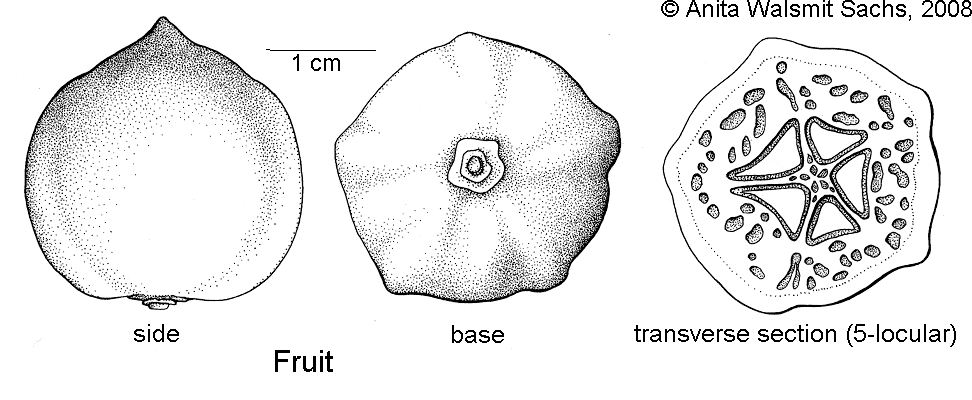 Leaves: petioles channelled above. Flowers: petals ± straight and flat, completely hairy. Staminate flowers: filaments and connectives hairy. Pistillate flowers: ovaries 26-locular. Fruits laterally flattened to 5-cornered to subglobular, wall 617 mm thick, with cavities.
