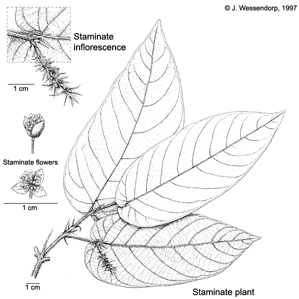 Shrubs to small trees up to 17(27) m tall, dbh up to 30 cm. Outer bark smooth to (slightly) rough, scaly to flaking, mottled. Indumentum usually dense, short to long. Branches smooth, pustulose when young, glabrescent, clavate glands absent or present. Stipules semi-persistent, narrowly ovate to ovate to linear, 713 by 13.5 mm, often blackish when dried, margin entire, involute, apex rounded (to acute), hairy, long hairs along margin, clavate glands absent to few basally. Non-reduced leaves: petiole pustulose, 930 by 0.81.1 mm, hairy, clavate glands absent (to few); blade elliptic to obovate, 8.523 by 36.5 cm, length-width ratio 2.54, chartaceous to coriaceous, base obtuse to truncate to slightly cordate, often oblique, margin entire to slightly wavy to apically dentate to serrate, apex cuspidate, upper surface smooth, glabrous to hairy, glabrescent, puncticulate glands absent to numerous, lower surface smooth, hairy, puncticulate to clavate glands absent or present, domatia usually present, with hair tufts; venation pinnate, 1115 secondary veins per side, ending parallel to the margin or in the margin. Stipuliform leaves linear to narrowly ovate, 410 by 1.52.5 mm, margin entire to wavy, apex rounded to acute, hairy, long hairs along margin, clavate glands absent. Staminate inflorescences up to 5 cm long, basally c. 0.6 mm thick, unbranched, hairy, tubular to clavate glands present, nodes up to 18 per inflorescence; bracts ovate, c. 1.1 by 0.6 mm, margin entire, apex acute, hairy abaxially only, clavate glands absent to few. Buds globose, hairy. Staminate flowers c. 4.5 mm in diameter, green-yellow to reddish; bracteoles absent; pedicels 12 mm long, hairy, clavate glands present; sepals 3, basally connate, elliptic, recurved, c. 3 by 2 mm, margin entire, apex acute, hairy abaxially only, clavate glands absent; stamens up to c. 56, filaments c. 2 mm long; anthers c. 0.4 by 0.3 mm, basifixed to dorsifixed; connective not to slightly widened. Pistillate inflorescences up to 8 cm long, hairy, clavate glands absent (to present), nodes up to 9 per inflorescence; bracts ovate to narrowly ovate, 1.54 by 1 mm, margin entire, apex acute to rounded, hairy, clavate glands absent to few. Pistillate flowers white; bracteoles absent or present, subtending the calyx, ovate, c. 3 by 1 mm, margin entire, apex acute, hairy, long hairs along margin, clavate glands absent; pedicels 34.5 mm long, hairy, clavate glands absent to numerous; sepals 35, free, ovate to narrowly triangular, 47 by 0.91.5 mm, margin entire, apex rounded to acute, hairy, long hairs along margin, clavate glands absent; ovary 3-locular, echinate, woolly hairy, clavate glands absent, spines 0.51.8 mm long, hairy, long hairs apically, clavate glands absent; style 12.5 mm long, hairy, clavate glands absent; stigmas 611 mm long, densely covered with granulate papillae on the inside, hairy abaxially, clavate glands absent. Fruit an echinate, lobed capsule, 1014 by 510 mm, greenish; carpel inside hairy, clavate glands absent; column 4.55 by 4.55.5 mm. Seeds glossy, globose, c. 5 by 5 by 4 mm; hilum elliptical to deltoid, c. 1.5 by 11.5 mm.