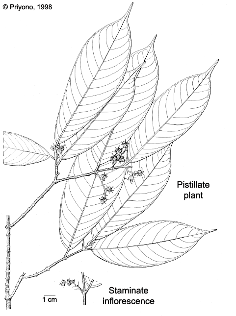 Leaves coriaceous to chartaceous, lower surface with or without domatia, 715 secondary veins per side. Staminate inflorescences up to 10 cm long, with up to 28 flowers. Staminate flowers with up to 109 stamens. Pistillate inflorescences with bracts 3.512 mm long, often with only a single terminal fruit developing. Fruits with spines exceeding 1 mm in length, stigmas 1022 mm long. Philippines and New Guinea. |