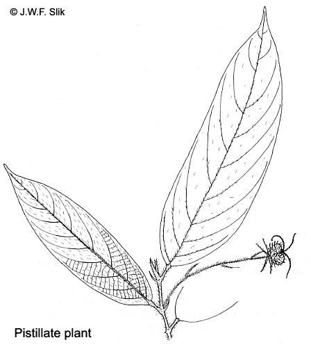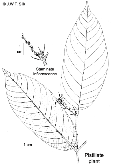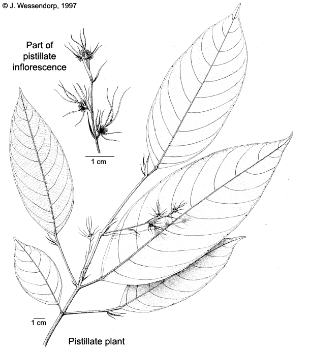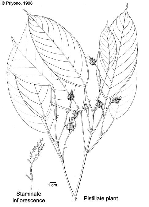 Notes A very variable species, hence the large number of synonyms. The petioles range from very short (c. 0.5 cm) to very long (c. 4.5 cm); the stipules can be very small (c. 2 mm long) to quite large (c. 1 cm long); domatia can be present or absent; leaf sizes range from small (c. 57 cm long) to very long (up to c. 27 cm); the pistillate inflorecences can be slender with only 1 terminal fruit developing, or quite thick and with many fruits developing over the whole inflorescence; the fruits can have long spines (whole distribution range) to very short to almost verrucose spines (mainly the Moluccas and New Guinea). As a rule (but not always) the plants become more hairy, the stipules become longer, domatia are more often present, and the inflorescence axes become thicker with more fruits with increasing altitude.