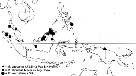 Hancea grandistipularis (Slik) S.E.C.Sierra, Kulju & Welzen in S.E.C.Sierra, Kulju, Veldkamp & Welzen, Blumea 52 (2007) 363. Mallotus grandistipularis Slik, Blumea 43 (1998) 227; in Slik & Welzen, Blumea 46 (2001) 11, Fig. 3, Map 1; in Slik, Tropenbos-Kalimantan ser. 4 (2001) 153, Fig. 7.3, Map 7.1. Type: Burley, Tukirin et al. 2021 (L holo; CANB, K, US iso), Indonesia, Sumatra, Riau Province, Tigapulu Mts, 5 km West of Talanglakat.