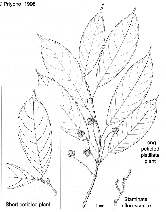 Leaves coriaceous, lower surface without domatia, 1117 secondary veins per side. Staminate inflorescences up to 3.5 cm long, with up to 16 flowers. Staminate flowers with up to 46 stamens. Pistillate inflorescences with bracts 1.84 mm long, several fruits developing. Fruits with spines not exceeding 1 mm in length, stigmas up to 10 mm long. Borneo. |