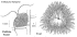 Stipules early caducous. Petioles 2890 mm long, sometimes densely covered with reddish clavate glands, apically strongly pulvinate and bent, giving the leaf a slightly peltate appearance. Leaf blades 930 by 2.518 cm, lower surface without domatia. Inflorescences often densely covered with glands excreting a conspicuous sticky yellow-red exudate. Staminate inflorescences branched. Pistillate inflorescences with several fruits developing; pedicels 227 mm long. Fruit spines often with a globose terminal gland. |