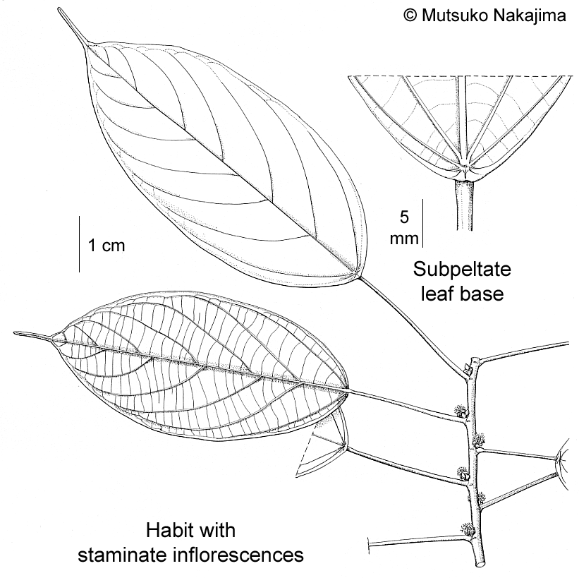 Small tree up to 7 m tall, dbh up to 8 cm. Indumentum dense, yellowish, short to long. Branches smooth, glabrescent. Stipules persistent, narrowly triangular, 710 by 11.1 mm, margin entire, apex acute, hairy. Non-reduced leaves: petioles 57 by c. 1 mm, hairy, leaf blade ovate, 6.516.5 by 3.58.5 cm, length-width ratio 22.5, chartaceous, base deeply cordate, surrounding the petiole, slightly oblique, margin irregularly wavy, apex acute to acuminate, upper surface smooth, evenly hairy, lower surface smooth, evenly hairy, domatia absent; venation palmate, veins 6 at petiole attachment, 912 secondary veins per side along midrib, ending parallel to the margin. Stipuliform leaves (narrowly) triangular, 22.5 by c. 0.5 mm, hairy, margin entire, apex acute to rounded. Staminate inflorescences up to 3.5 cm long, basally c. 0.8 mm thick, unbranched, hairy, nodes up to 31 per inflorescence; bracts narrowly triangular, at right angles with rachis, 4.35 by c. 0.7 mm, margin entire, apex acute, hairy. Buds globose with acuminate apex, hairy. Staminate flowers 4.55 mm in diameter, red; bracteoles absent; pedicels 3.54.5 mm long, hairy; sepals 3, persistent (to caducous), basally connate, ovate, 33.8 by 1.82 mm, margin irregular, apex acuminate, hairy abaxially, glabrous adaxially; stamens up to 100, filaments up to 4 mm long, glabrous, anthers c. 0.5 by 0.5 mm, basifixed; connective not widened. Pistillate inflorescences and fruits unknown.