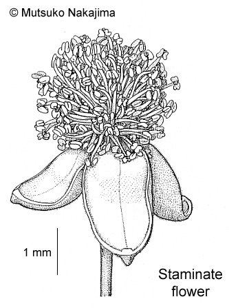 Shrubs to small trees, up to 15 m high, dbh up to 15 cm, dioecious. Outer bark smooth, grey-brown. Indumentum composed of short (with a pointed tip), long simple and tufted hairs, and capitate glandular hairs with multicellular stalks. Stipules narrowly triangular, 57 by 1.82 mm, caducous to early caducous, margin serrate, hairy, apex acute, sparsely to densely hairy on both sides. Leaves: petiole 114 cm by 11.3 mm, not grooved above, glabrescent; blade ovate to elliptic, 7.527 by 611 cm, length/width ratio 2.53, chartaceous, base subpeltate up to 2 mm, rounded to obtuse, margin entire, apex caudate, upper surface sparsely hairy, glabrescent, lower surface sparsely hairy on midrib and nerves, with few glandular hairs, nerves 57 per side, with hair tuft domatia. Inflorescences single or two together; peduncle 0.51.2 by c. 1 mm; staminate racemes 0.50.8 cm long, nodes per branch 36; pistillate ones 1.53 cm long, bracts 4 or 5; bracts triangular, 1.82.5 by 11.5 mm, persistent, margin entire, apex acute, upper surface hairy, lower surface densely hairy; bracteoles absent. Flowers: pedicels densely hairy; sepals margin entire, apex acute. Staminate flowers 57 mm in diam.; pedicels 57 mm long; sepals ovate, 4.55 by 22.5 mm, densely hairy outside, subglabrous to sparsely hairy inside; stamens 200250, glabrous, filaments 27 mm long, thecae ellipsoid, 0.50.7 by 0.40.5 mm, connective widened. Pistillate flowers c. 5 mm in diam.; pedicels 0.72 mm long; sepals triangular, 46 by 11.5 mm, valvate and/or imbricate, hairy; staminodes absent; ovary 12 by 23 mm, densely hairy; style 11.5 mm long; stigma 812 mm long. Fruits 815 by 1520 mm, pale green, densely hairy outside, spines 140170, straight, 610 by c. 1 mm, densely hairy; wall 12 mm thick; column 9.515 by 914 mm. Seeds 912 by 911 by 810 mm, smooth, shiny, dark brown.