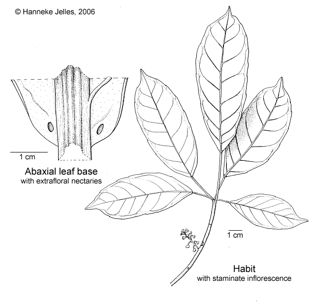 Trees 625 m tall, dbh1091 cm, bole 812 m high. Outer bark light brown to reddish brown, smooth to rugose, thin, soft; inner bark light brown with pale yellow sap, c. 2 mm thick, with slight fruit smell; sapwood pale yellow, soft. Leaves: petiole 19.5 cm long, apically with transverse ridges adaxially; blade elliptic (to obovate), 6.518 by 2.59 cm, length/width ratio 22.6, thin coriaceous, base attenuate, usually with a pair of glands abaxially, margin serrulate, tips apiculate, distance between teeth 12.1 cm, apex acuminate to cuspidate, upper surface dull when dry; venation indistinct above, prominent beneath, nerves 68 pairs. Flowers yellowish green, calyx greenish brown. Staminate inflorescences racemose, fascicles up to 4 per axil, 16 cm long; bracts 3, triangular (bracts of the form P. acuminatum with glands), apex entire, central one large, c. 1 by 1 mm, 2 smaller lateral bracteoles c. 0.25 by 0.25 mm. Staminate flowers 3.88.5 by 35.8 mm; pedicel 1.56 by 11.5 mm (see note 4 for exceptional lengths of 5.57.5 mm); calyx lobes 25.5 by 1.53 mm, margin entire; stamens 619, in 2 whorls, filaments 0.251 mm long, anthers 0.251 by 0.251 mm. Pistillate inflorescences up to 2 per axil, 26 cm long; bracts 1, triangular, c. 1 by 1 mm, apex entire. Pistillate flowers 7.512 by 3.86 mm; pedicel 3.26 by 11.5 mm; calyx lobes 24 by 1.53 mm, with scattered glands at the union of the basal two lobes, margin and apex entire; ovary c. 3 by 2 mm, locules 410, stigmas free and straight. Fruits orbicular, 1.23 cm in diameter, glabrous, pale green (immature?); pedicel 0.53.5 cm long; remnants of stigmas present. Seeds reniform, 3 per fruit, 0.81.9 by 0.61.2 cm.