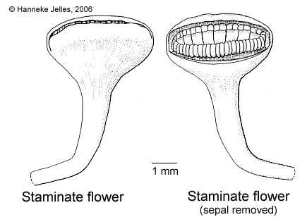 4. Collections from Borneo (Endert 4913, KEP FRI 41342, Kostermans 21385, van Niel 4051) and from Sumatra (Hotta & Okada 1608) have 79.5 mm long staminate flowers and pedicels of 5.57.5 mm long. These characters are very different from all other specimens, but there is still anoverlap. Therefore, these specimens are not given a new status.