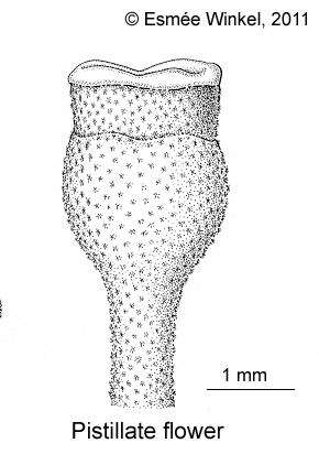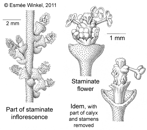 Tree 1025 m high. Leaves: petiole hairy; blade elliptic or ovate, 15.520 by 10.511.5 cm, base peltate or not, cordate to rounded, with 2 cylindrical glands beneath at insertion, apex rounded to acute, sparsely hairy above, densely hairy below, glands along the margin above, basally palmately 79 nerved, 49 nerves on each side in upper part, with glands in the ramifications beneath. Inflorescences paniculate, up to 35 cm long, lowest side axes up to 7 cm long, densely hairy. Staminate flowers: pedicels c. 1 mm long; sepals 4- or 5-lobed; stamens ca. 11, androphore glabrous. Pistillate flowers: pedicels 3-6 mm long; sepals 4- or 5-toothed, ovary 2- or 3-locular, stigma flattened. Fruit: globose, minutely hairy.