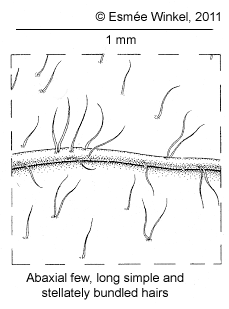 Branches pilose to densely hairy. Indumentum consisting of stellately bundled and/or simple hairs. Leaf margin with numerous minute glands |