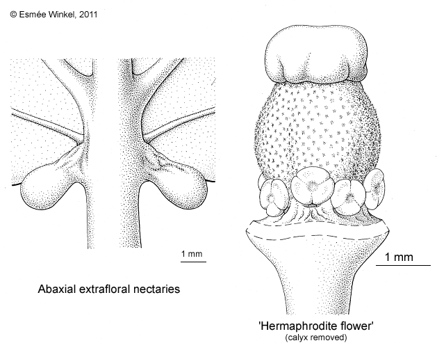 Inflorescence paniculate. Petiolar glands 2 at lower leaf surface at insertion |
