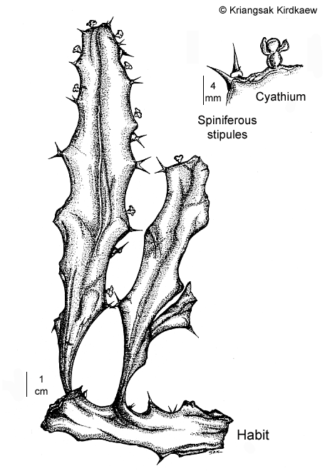 Erect shrub, to 4 m tall, fleshy and slightly succulent, base diam. to 6 cm, spiny, branching, usually with terminal leaves; stem and branches without articulation, base nearly terete, otherwise with 5 indistinct angles (not winged) and spine-shields in 5 distinct rows, younger branches c. 15 mm in diam., sinuses between spine-shields shallow to absent. Spine-shields 2-3 cm apart, spines in pairs, 2 mm long, grey-brown to blackish, persistent. Indumentum absent. Stipules transformed into spines. Leaves subsessile, obovate, 10-18 by 3-4 cm, base attenuate, margin entire, apex rounded, persistent during the vegetation period. Cyathia not seen in Thailand, outside of Thailand arranged in axillary groups of 3, the central one subsessile, the lateral ones with a peduncle of 6-7 mm, bracts 4 mm long, cyathial glands 5, 1 by 3 mm. Flowers and fruits not seen.